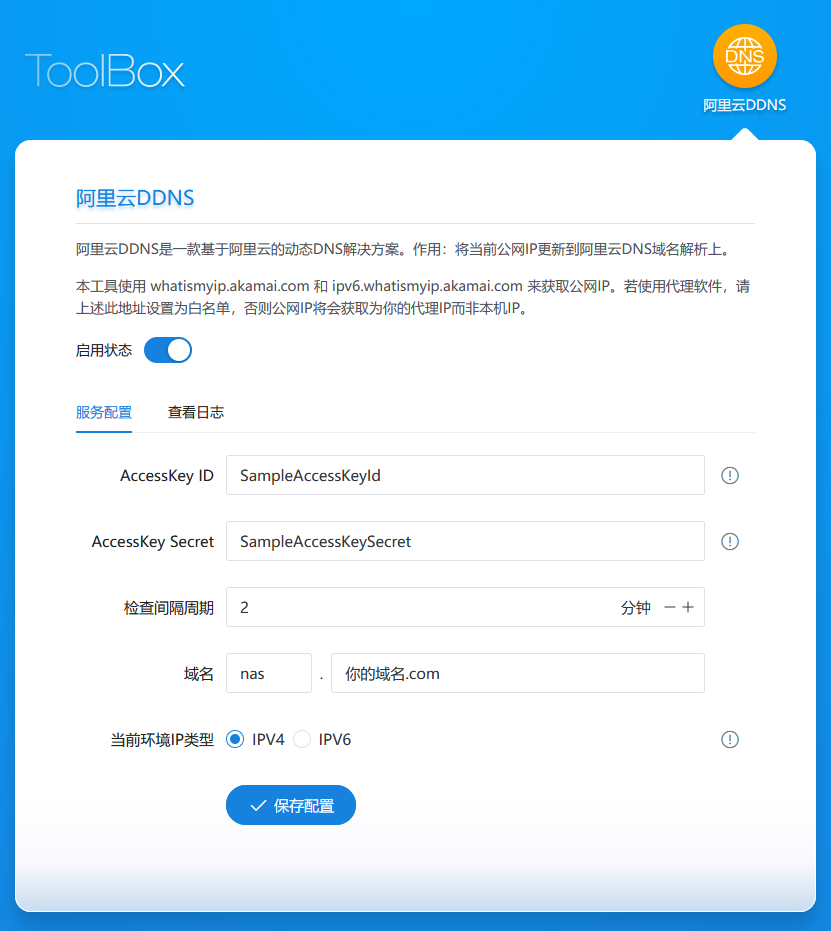 DDNS(Dynamic-DNS)也就是动态将IP地址更新到 DNS 解析服务。在之前,我试过很多软件,用起来都不如有UI界面的舒服。因此我使用了 Panda-Studio 开发的一个基于Docker的阿里云DDNS方案,这套方案带有管理面板界面,只需要鼠标点击录入就可以启用了,非常方便。