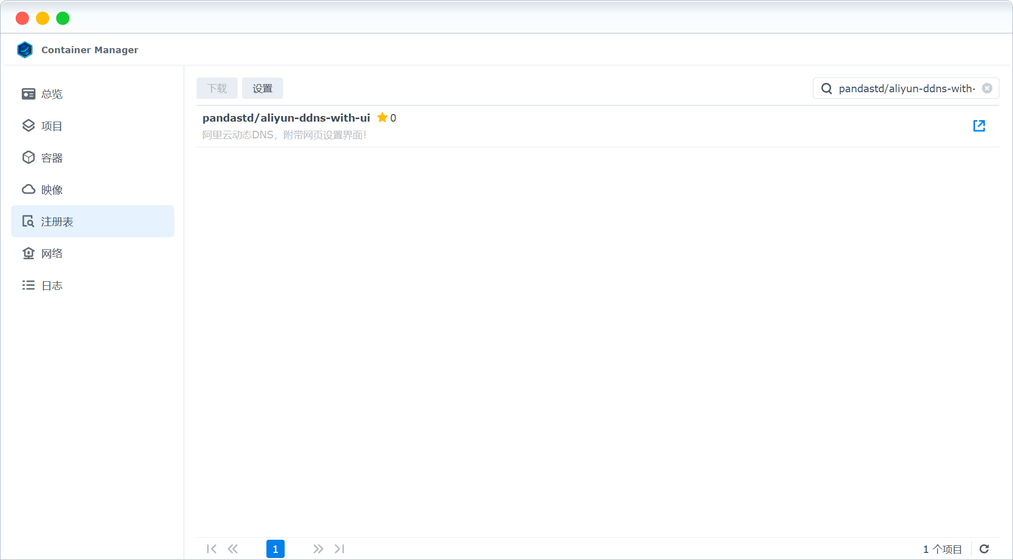打开群辉 Docker,从注册表中输入 pandastd/aliyun-ddns-with-ui ,选中后,下载这个镜像。