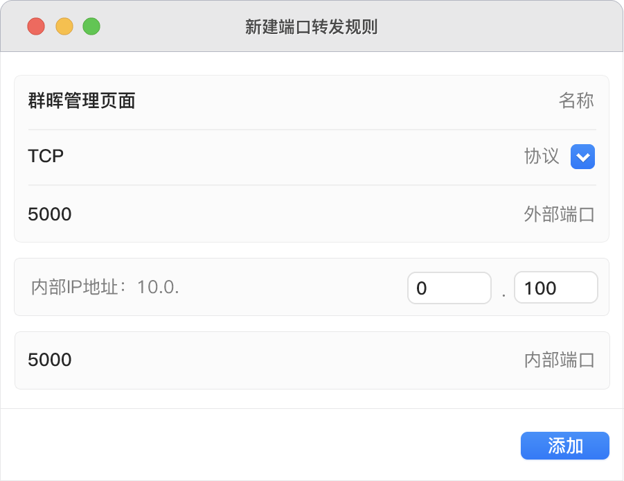 例如,群辉的管理页面是:5000,将这个端口在路由器上映射为 5000(或其他端口号),就能用 http://你设置的域名+ 英文冒号 + 5000 来访问到群辉的管理页面了。